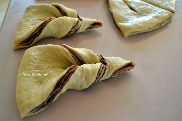 Grease a baking sheet large enough to hold all the pieces. I used a pizza sheet. Place the triangles on it to form a circle. Retrieve the little ball of dough put aside earlier. Roll it into a thin rope. Starting from one side coil the rope to the end. Place it in the center. Pinch the open ends of the triangles together. Mix the milk and sugar for the topping and brush it liberally over the top.